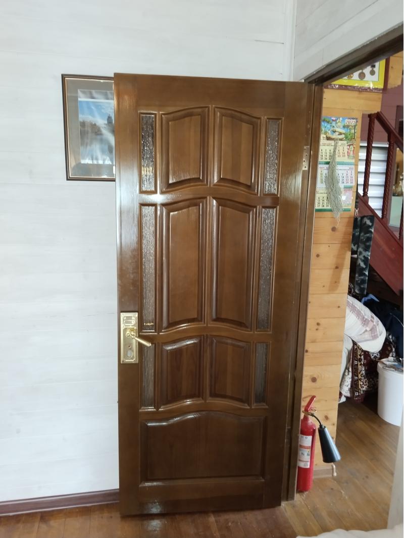 Межкомнатная дверь Межкомнатная дверь из массива дерева, новая, в упаковке, ширина 70см. К двери прилагается того же цвета коробка. На фото продаваемая дверь в упаковке и фото как такая дверь выглядит установленная на неотапливаемой даче. Дверь хорошего качества, хорошей сушки, не из прессованной бумаги, точно не покоробит.